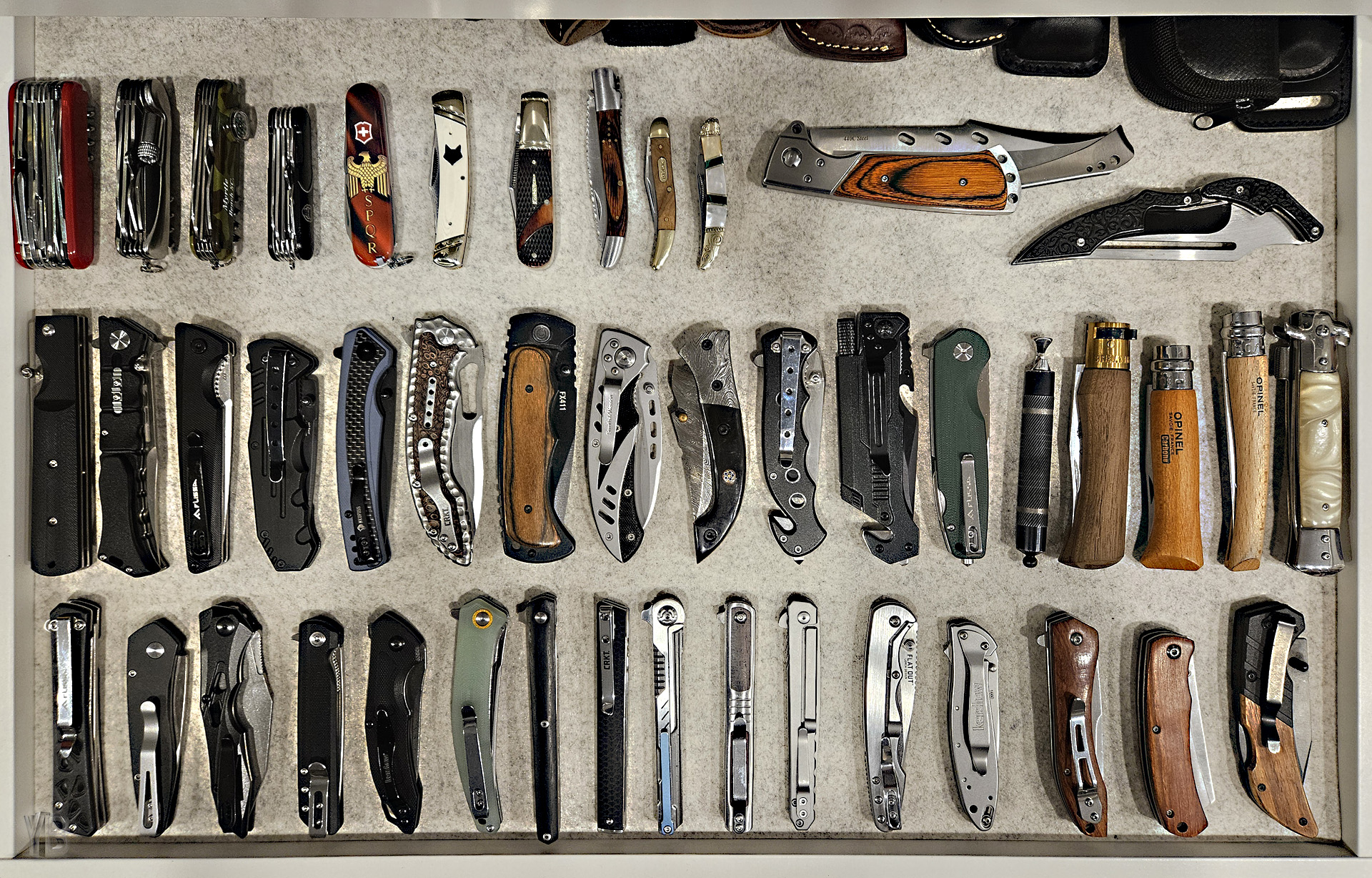 Feb. 10th, 2026 06:50 pmНаписав про свои ножики, решил провести инвентаризацию. Облазил все хозяйство, подоставал все ножи, что смог найти, из разных щелей, из штанов, курток, ящиков, из машин, рюкзаков, велосипедных подсумков, из гаража и подвала, собрал их в кучу и свалил в один ящик.